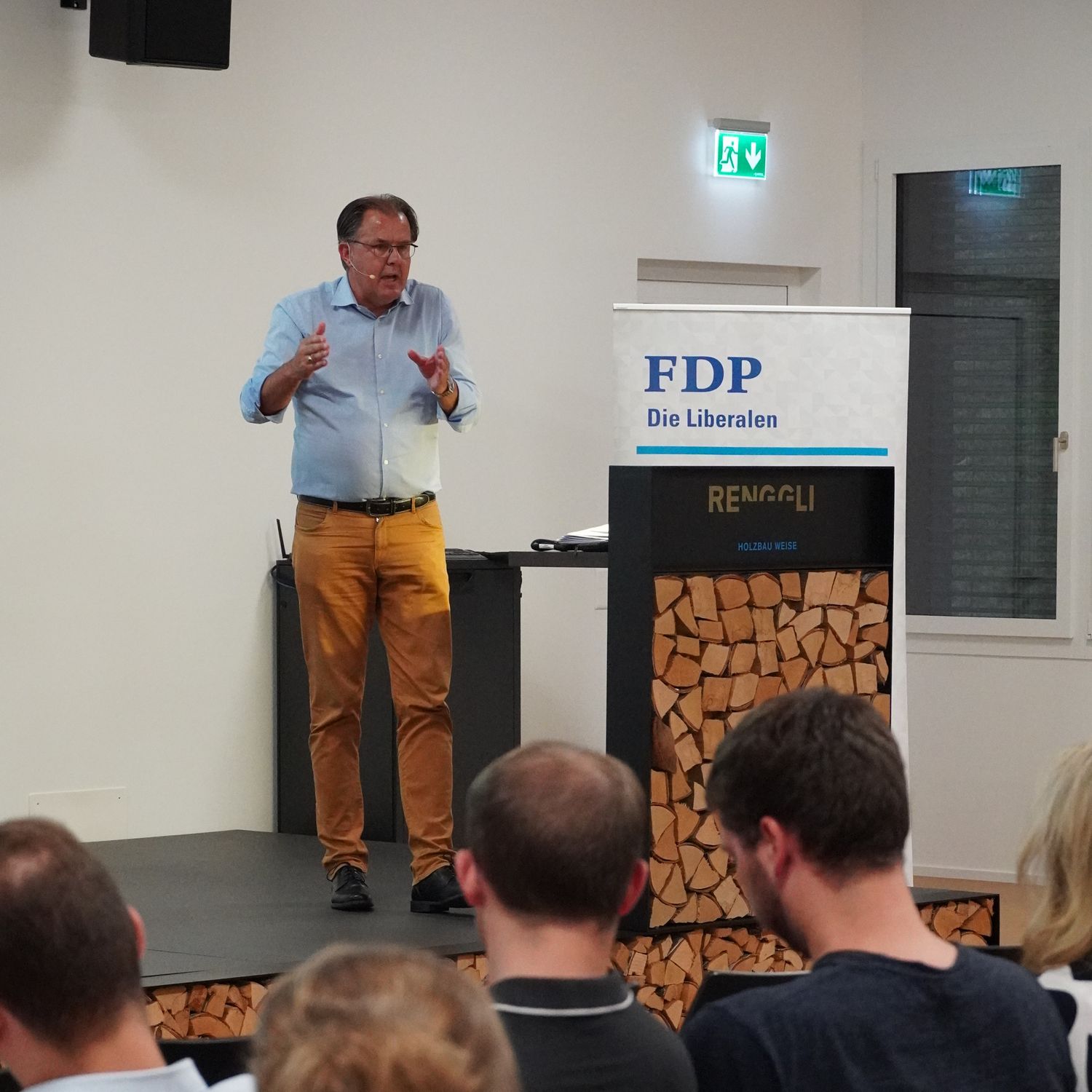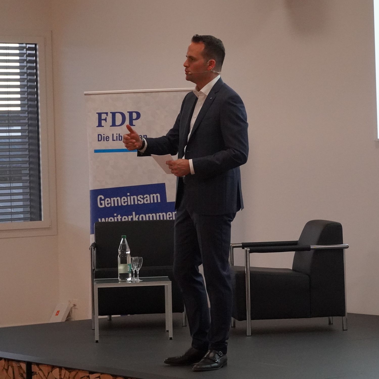 Nationalrat Peter Schilliger ging auf die Amortisation der umfangreichen Unterstützungspakete zur Bekämpfung und Abfederung der wirtschaftlichen Folgen während der Pandemie ein. Er erklärte, dass die eine Hälfte der rund 30 Milliarden Franken Coronaschulden mit den Überschüssen der vergangenen Jahre verrechnet werde und die andere Hälfte innerhalb eines absehbaren Zeithorizonts von acht Jahren amortisiert werden soll. Dabei betonte er die starke Unterstützung der FDP für dieses Vorgehen und führte aus, warum das Einhalten der Schuldenbremse für unser Land wichtig ist.